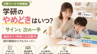 学研のやめどきに悩むワーママへ。3児ママが進研ゼミ→学研→公文書写の試行錯誤をリアルに解説。やめどきサインと切り替えのポイントまとめ。